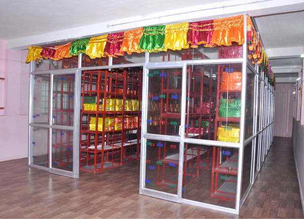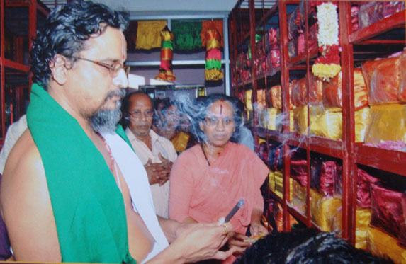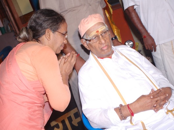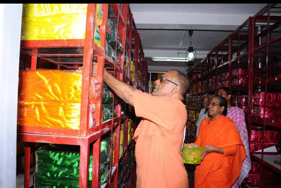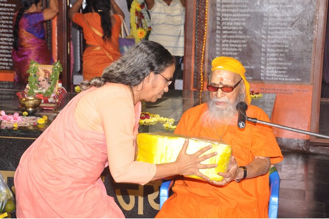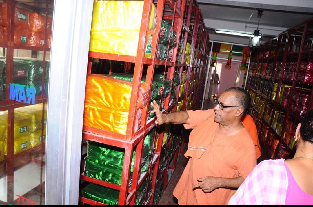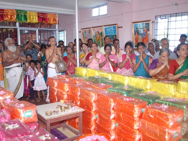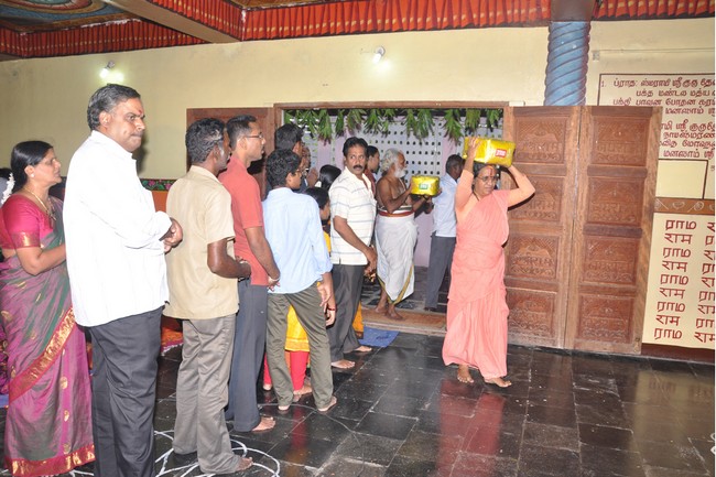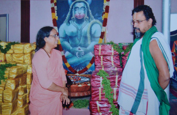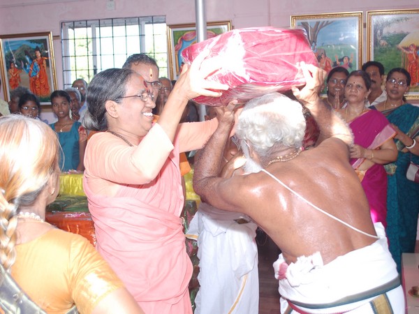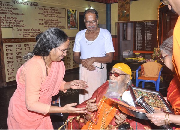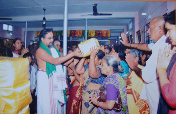 Mathaji visits Kanchi Mutt every year to seek the blessings of Maha Periyava. When she expressed her thoughts to Sri Sri Vijayendra Saraswathi Swamigal, he was overwhelmed and said that the village Kolathur where Sri Raghavashram is situated is a really lucky place where the Divine has chosen this place to abode the Divine Mother Gomatha and the Divine Name Rama Nama and appreciated the good work of Mathaji and asked her to receive the first Ram Nam Biksha of 2 crores for the pradhishta from His Holiness Himself and gave all the Namas submitted to the Mutt and Subsequently as per the instructions of His Holiness the Mutt kept sending all the collected Namas through devotees to Raghavashram. He also instructed Mathaji to do the Pradhishta as and when collected. (every 108 crores). His Holiness also instructed to distribute printed sheets to the schools so as to enable students inculcate the habit of writing Ramnam everyday. As instructed, Shankara group of schools, Vivekananda group of schools and many such were distributed with Ram nam sheets and collected after duly completed. By then, another 14 crores Ram Nam got collected. Totally 108 crores were there. They were all counted and packed as 50 lakhs per bundle with preservatives and 3 layer packing. Local village downtrodden women were employed and the process was done. Likewise the mission started expanding gradually and reached the awareness of many devotees . In the meanwhile, as ordained by His Holiness Vijayendra Saraswathi Swamigal, the first 108 Crores Ram Nam Pradhishta was done in the year 2012. Shri Muralidhara Swamigal presided the function.
